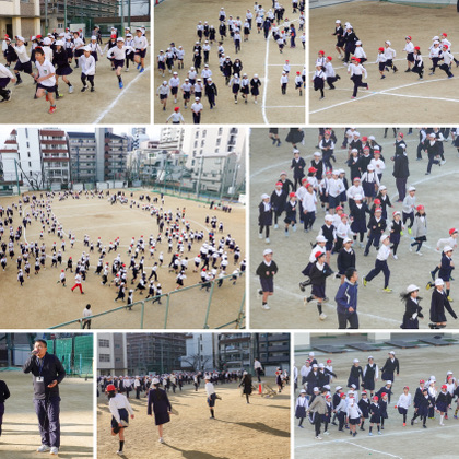 2月3日(月)から2週間は、マラソン週間ということで、ランニングで体力づくりに取り組んでいます。1日2学年ずつ、1年生と6年生、2年生と4年生、3年生と5年生がいっしょに走っています。