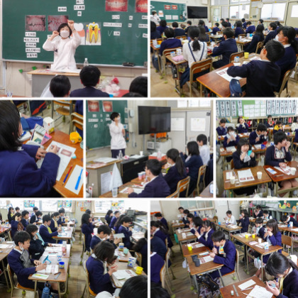 2,3時間目、歯科衛生士さんに来ていただいて、各教室で「歯と口の健康教室」が行われました。