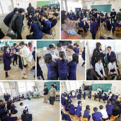 5時間目、関西外語専門学校の留学生と交流しました。2回目の今回は「遊び」がテーマです。留学生のみなさんに母国の遊びを教えてもらい、みんなで一緒に遊びました。