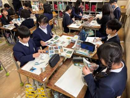 5日(水)3時間目に5年5組のO先生による図画工作科の公開授業がありました。授業では「わたしの美術館」をテーマに取り組みました。授業のはじめに、「東京国立近代美術館」の館内をオンライン上の360°カメラでのぞいてみて、様々なテーマの展覧会が開催されていることを知りました。そこから、テーマを決めて自分だけの展覧会をつくることになったのですが、アートカードを用いてオリジナル展覧会を完成させようと5組の子たちはとっても楽しそうに作業に取り組んでいました。