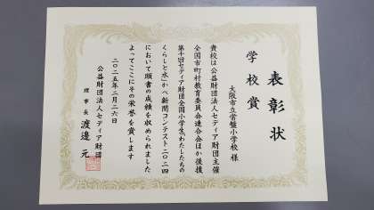 その壁新聞を、公益財団法人セディア財団の主催する『わたしたちのくらしと水 かべ新聞コンテスト』に応募したところ、見事「学校賞」を受賞することができました!