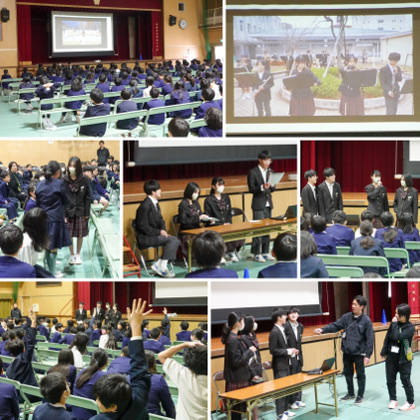 中学校生活のあれこれを、スクリーンも使いながら説明してくれた生徒会のみなさん。その後、部活動の紹介動画が放映されました。