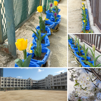 1年生が植えたチューリップが咲き始めました。どうしたわけか、黄色のチューリップがたくさん咲いていて、他の色はこれからのようです。