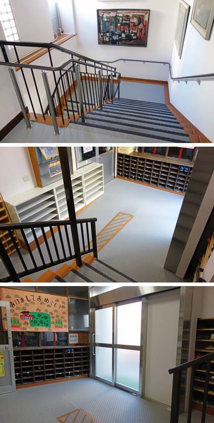 去年の11月から始まった改修工事は、年末までに無事完了。玄関にスロープができ、扉も新しくなりました。靴箱があるフロアも広く使えるようになっていて、段差もなくなっています。ちなみに靴は、扉のところで脱いで、中に持って入って靴箱に入れることになっています。
