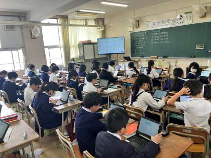 社会科では、日本の周りの海や日本の地方の名前などを学習しています。タブレット端末を使用して一生懸命調べています。