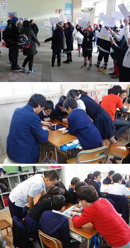 まずは、本校ロビーでご対面。子どもたちが、自分のクラスに来てくれる方の名前を書いたボードを掲げてアピール。そろったところで教室へ移動です。