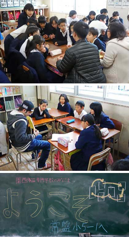 5年生は、例年、関西外語専門学校の留学生と交流学習をしています。今年度は、今日が1回目。毎回1学級8名ずつ、40名の留学生が来てくださることになっています。留学生の出身地域は、アメリカ、イギリス、インドネシア、韓国、スウェーデン、タイ、台湾、中国、香港、マカオとさまざま。来日してからの日数もさまざまのみなさんです。