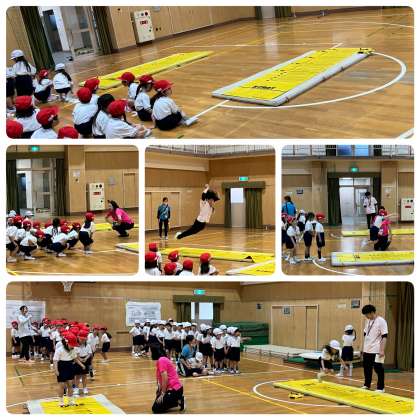 1年生は体育館で初めての新体力テストを実施しました。種目は立ち幅跳びです。授業前にはきれいに並んでいます。準備運動をしっかりと行い、スタートです。はじめは先生が跳び、少し説明をしました。子どもたちはしっかりと聞いていました。自分の番が来るととても楽しそうに跳んでいました。