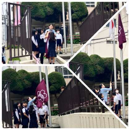 毎朝、児童会の子どもたちが校旗を揚げてくれています。この校旗はみんなで集めたベルマークで購入していただいたもので、4月に届きました。ありがとうございました。