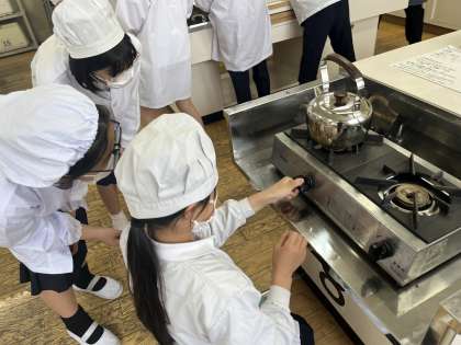 5年生の家庭科の調理自習で玄米茶をいれました。5年生にとっては、初めての調理実習でした。5年生の子どもたちは、初めての調理実習をとても楽しみにし、当日を迎えました。実習の中では、火の扱い方に注意し、同じ班の友達と協力している様子が見られました。お茶の味を味わっていただいた後には、片付けまで集中して実習に取り組むことができました。