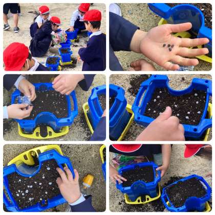 本日1年生では、朝顔の種を植えました。一人ひとり植木鉢に丁寧に土を入れ、丸い肥料を均等に置きます。そして人差し指第一関節まで土に穴を開け、朝顔の種を入れます。そして、土の布団をかぶせるようにそっと土をかぶせます。最後は十分に水をあげて終了です。どんな色の朝顔が咲くか楽しみですね。1年生のみなさん、朝顔のお世話を頑張ってね。
