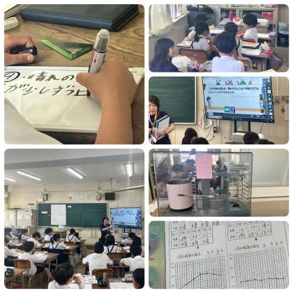 4年生の理科の学習では1日の気温の変化を調べています。今日は記録温度計で測定していたデータをもとに天気によって気温の変化に違いがあるのかについて学習しました。データをもとに考え、グループの友だちと話し合っています。