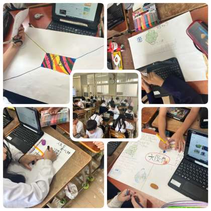 4年生の社会では、大阪府のいろいろな市について調べていました。タブレット端末を用いて、その市の歴史やゆるキャラや特産物、工業などについて調べ、画用紙にみんなでまとめていました。調べてみるとこれまで知らなかったことがたくさんあって楽しそうに活動していました。