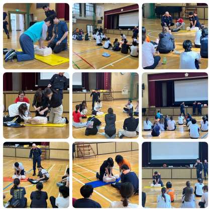 もうすぐプールでの学習が始まります。万が一の事故に備えて、救急救命研修を実施しました。消防署の方を講師にお招きし研修を行いました。ビデオで応急処置について学習し、胸骨圧迫の方法とAEDの使い方について実践していきました。研修を行っておりますが、この研修内容を活用することが無いように、安全に注意してプールでの学習に取り組んでいきたいと思います。