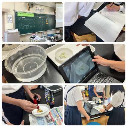 本日は6年生で本校教職員対象公開授業を行いました。理科の学習で、植物の葉にでんぷんができる条件について考え実験しました。日光に当たっている葉と、日光に当たっていない葉ででんぷんについて調べます。葉を安全に気を付けてお湯にしばらく漬け、その他とろ紙に包んで木づちでたたきます。そしてヨウ素液をたらします。一生懸命取り組んでいました。