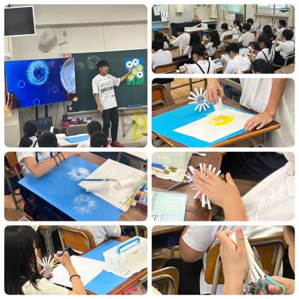 5年生の図画工作では、トイレットペーパーの芯を使って、たんぽぽの花や綿毛を描きました。トイレットペーパーの芯をタコの足のように細く切り込みを入れて、絵の具をつけて、画用紙にペタペタ。みんな重い思いの場所に描いていきます。次の時間は茎や葉を描いて仕上げていきます。楽しみです。