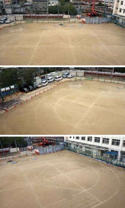 昨日、塀が一時撤去され、仮設体育倉庫が移動された運動場。現在はこんな感じになっています。