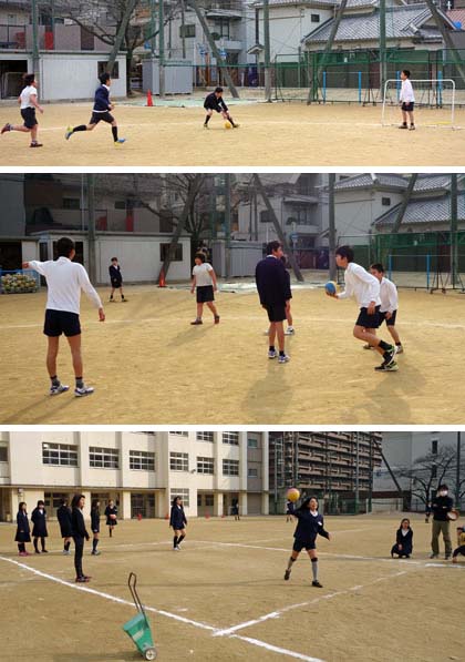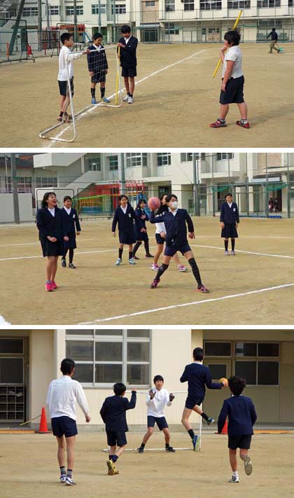 6時間目の運動場。6年5組の子どもたちが、男子はハンドボール、女子はドッジボール&ディスクドッジをしていました。お楽しみ体育という感じでしょうか。種目は、自分たちで決めたようですよ。