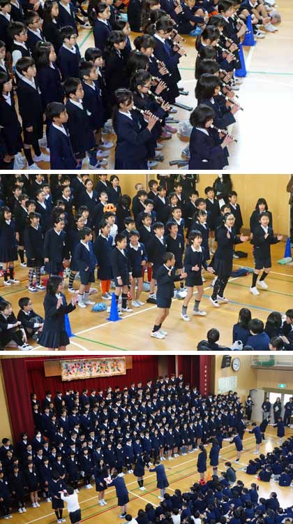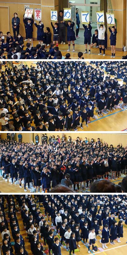 在校生が見守る中、花道を通って6年生が入場。まずは、在校生から卒業生へ「ありがとうの言葉」です。各学年、それぞれの表現方法で卒業生に感謝の思いを伝えました。
