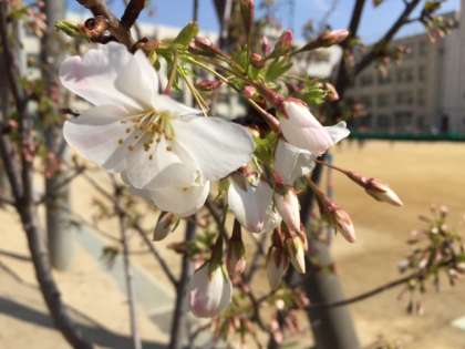 先週末、校庭の早咲きのサクラが開花したと思ったら、今日は運動場のソメイヨシノも咲き始めました。朝晩に少し肌寒さが残るものの、昼間の日差しは、もうすっかり「春」です。