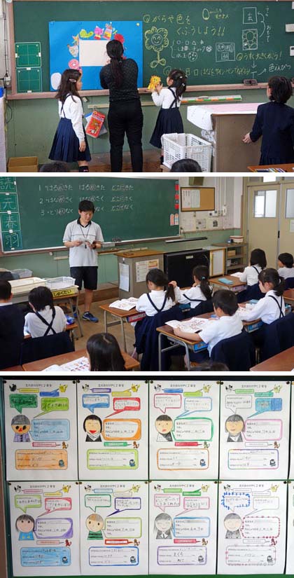 1組や4組、5組は、図工の学習中。自分マークづくりをしていました。好きな動物をイメージしたもの、形を工夫したもの。色えんぴつでていねいに色がぬられていて、なかなか上手に仕上がっていました。