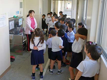 1時間目、職員室横のトイレの前に1年生の集団が。1組の子どもたちが、担任のU先生の話を聞いていました。トイレの使い方やマナーから、立ち位置・座る位置の話まで、具体例や笑いを交えたU先生の話を、子どもたちは、ときおり大笑いしながら聞いていました。