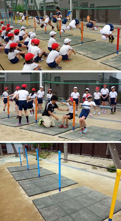春休みに、鉄棒のところに「衝撃吸収マット」が設置されました。PTAの予算で購入していただいたものです。それまでは古いマットを敷いていましたが、破れや汚れ、カビが目立っていました。安全性アップで、いろいろな技に挑戦しやすくなりました!