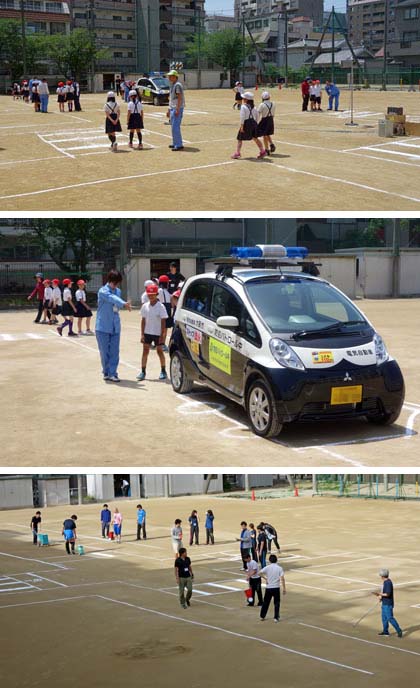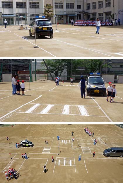 2〜4時間目、運動場で交通安全教室が行われました。阿倍野警察署から2名の警察官と、阿倍野区役所からたくさんの「地域見守り隊」の方が来てくださいました。運動場は、朝から仮想道路に早変わり!