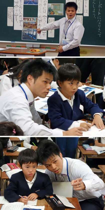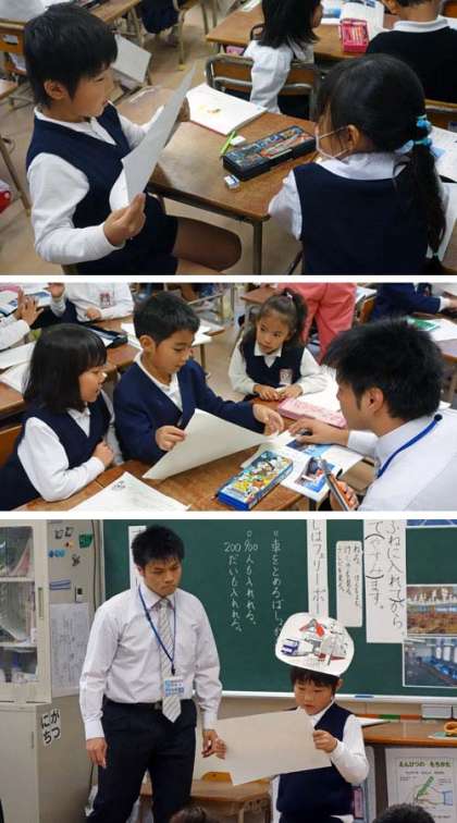5時間目、1年2組で、教員対象の参観授業(教員の研修)が行われました。他のクラスは4時間授業で下校したのですが、1年2組だけ5時間も授業を行いました。教科は国語です。