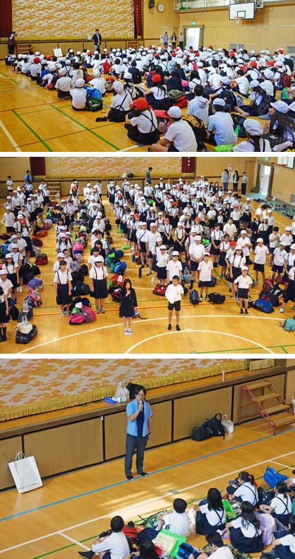 帰校式。児童代表のあいさつでは、1泊2日の思い出のほんの一部が語られていました。続きはお家で! というところですね。