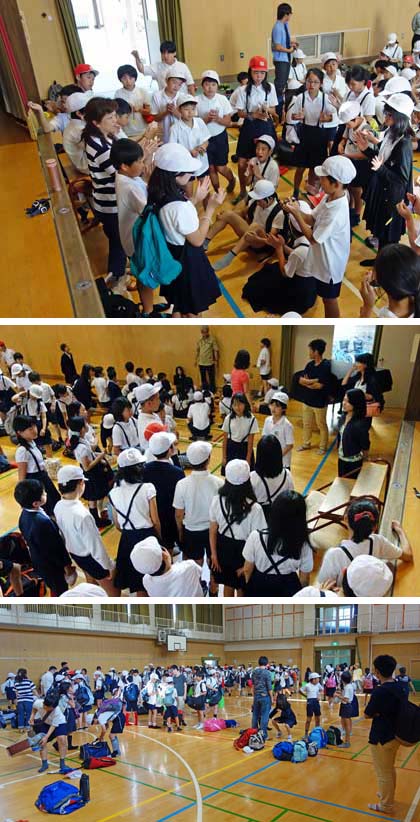 午後4時、予定より1時間早く小学校に帰ってきた6年生。早くなったにもかかわらず、たくさんの保護者の方がお迎えに来てくださっていました。