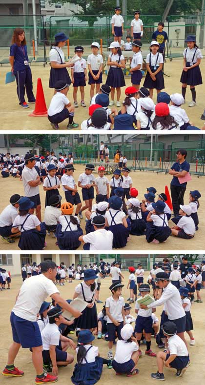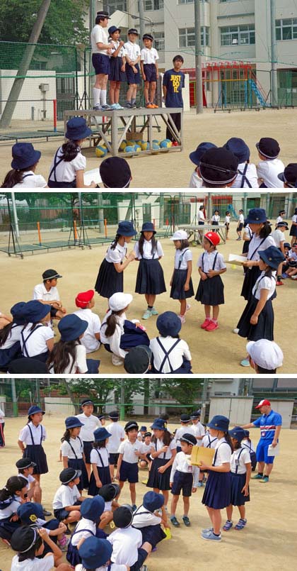 朝のホップタイムの時間に、たてわり集会がありました。25日は赤・緑グループの、26日は黄・青グループの集会です。たてわり班で集まるのは、この日が初めてです。