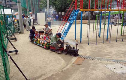 写真は、シークレットイベントの「ミニSL」です。コンビネーション遊具を囲むように、レールが敷かれています。ミニとはいえ、本格的!