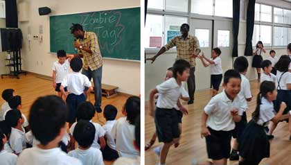 題して「Zombie game 〜ゾンビゲーム〜」。ゾンビ役は、マスク持参のJ先生。ゾンビのモノマネをしながら、他の子を追いかけ、タッチします。タッチされた子はゾンビになり、これまたモノマネをしながら他の子を狙います。「ふえ鬼」のイングリッシュバージョンですね。