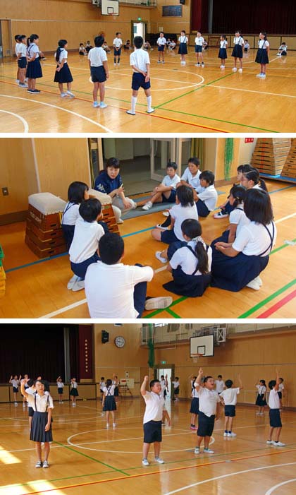 1時間目、係ごとに集まっての活動。講堂に集まったレク係。「やってみる→振り返る→改善する」というPDCAサイクルで練習を進めていました。