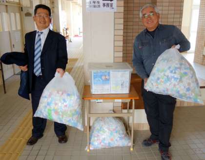 キャップはまだまだ回収中です。回収ボックスは、本校ロビーの管理作業員室前あたりに置いてありますので、みなさん、引き続き持ってきてくださいね。