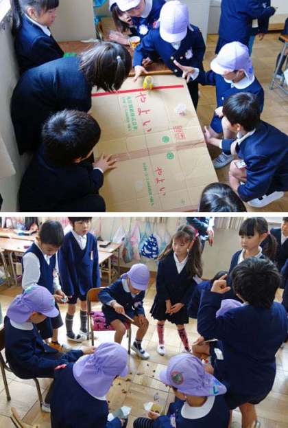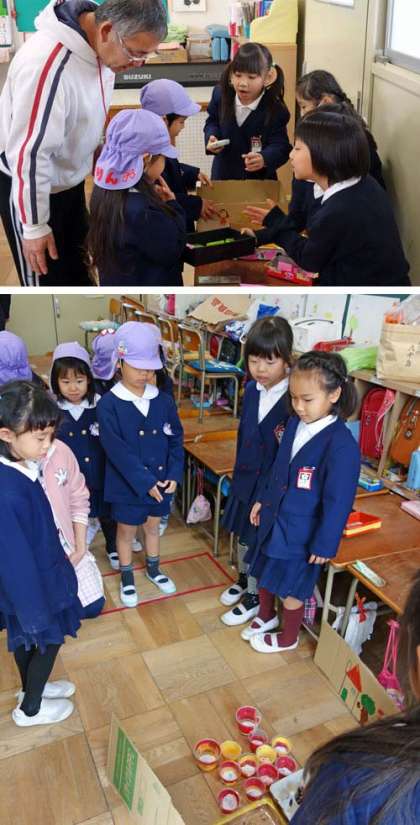 3時間目、文の里幼稚園の子どもたちを招いて、「あきのおもちゃまつり」が開かれました。4組の交流は、園児の人数の関係で、今日と木曜日の2回行うことになっています。