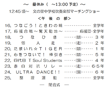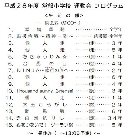 ホームページをご覧のみなさんに、ひと足早く、運動会のプログラムをお知らせします。なお、プログラムは、12日(水)に配付する予定です。
