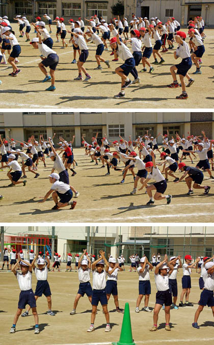 3時間目、4年生の練習。前半は団体競技「台風の目」、後半は団体演技「四代目 T Soul Students」の練習です。