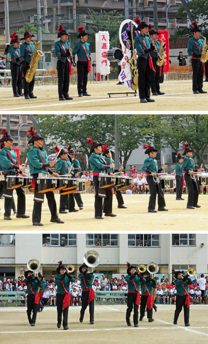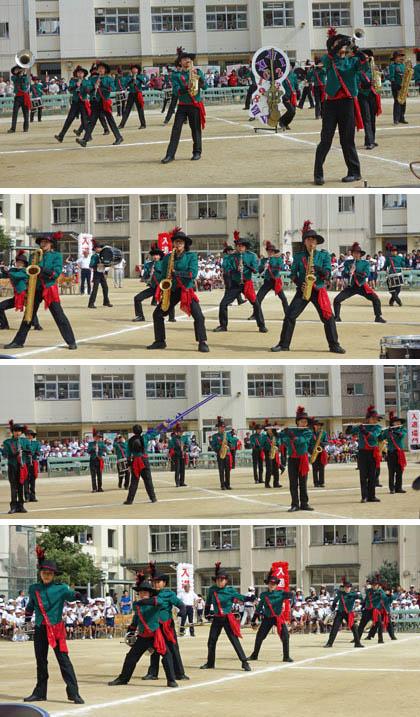 昼休み、文の里中学校吹奏楽部によるマーチングショーが行われました。緑と黒の凛々しいコスチュームに身をつつんだ部員のみなさん、「タイム」というテーマのマーチングショーを見せて、聴かせてくれました。