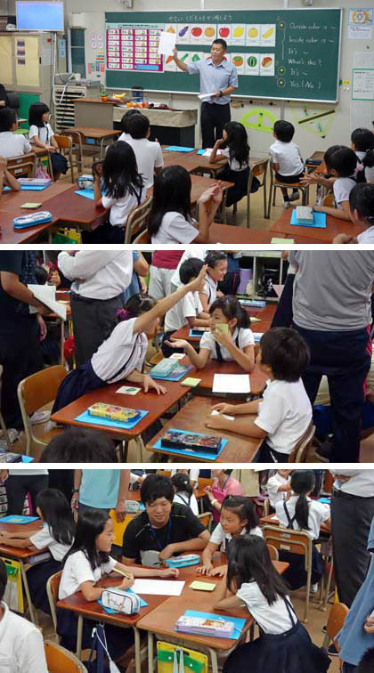 「野菜や果物を英語で説明したり、答えたりする活動を通して、英語に慣れ親しむこと」が、この時間の目標です。カードやDVDで、野菜や果物の英単語を確認した後、「せつめいゲーム」にチャレンジです。