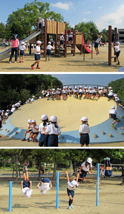 遠足日和のいいお天気の下、長居公園に行ってきました。前半戦、まずは子どもの広場へ。大きなすべり台やブランコ、木製遊具で、夢中になって遊ぶ子どもたち!