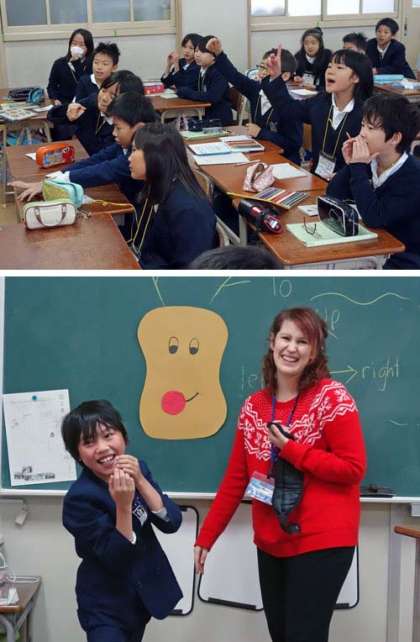 C−NETのH先生、今週は5年生での授業です。12月ということで、活動は冬・クリスマスにちなんだものでした。H先生のセーターもクリスマス色です!