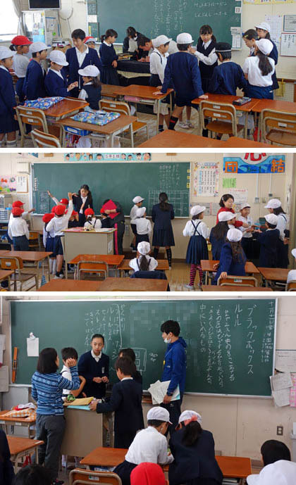 4日(金)のたてわり班長会議で、それぞれの班が出すお店(ゲームコーナー)の内容が決まっています。それを受けて、それぞれの教室に2班ずつ集まって(2つの班で1つのお店を出します)当日の役割や遊びのルール決め等をしました。