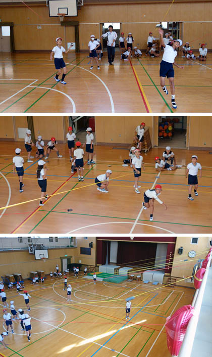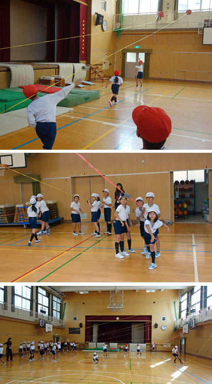 スロー・ザ・パイプは、講堂の2階ギャラリーから、フロアに向かってスズランテープを張り、そこにパイプを通したものです。そのパイプを、くり返し投げることで投力を鍛えようという、手作り器具です。