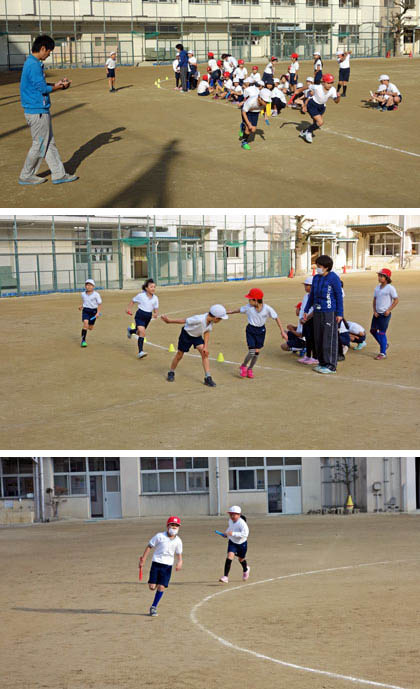 ちなみに、この時間は、3年6組と3年2組がペアで運動場を使うことになっています。2組は、先に走り幅跳び、後でリレーの順での学習でした。