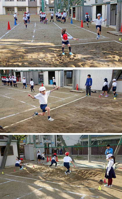 5時間目、運動場で体育の授業。前半の時間は、トラックを使ってリレーの学習、後半は、砂場で走り幅跳びの学習をしていました。