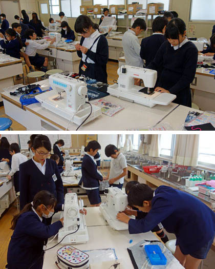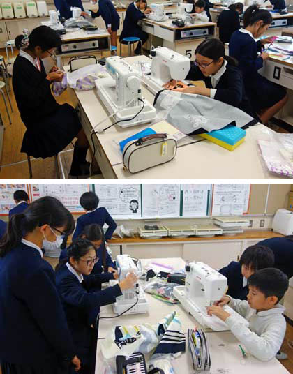 6時間目の家庭科室。ミシンを使ってエプロンを縫う子どもたちです。