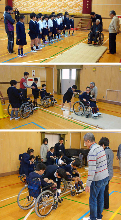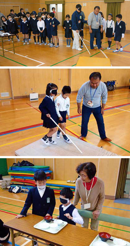 5日(月)と6日(火)の2日間、3年生対象に講堂で車いす&アイマスク体験が行われました。体験は、各クラス1時間ずつで、1クラスを2グループに分けて、ローテーションで活動しました。