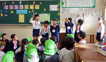 5時間目、常盤幼稚園の子どもたちを教室に迎えて、「おもちゃまつり」が開かれました。「どんぐりはこび」「どきどきケーキ」「わなげ」「魚つり」「ボーリング」などなど、手作りおもちゃでおもてなしです。